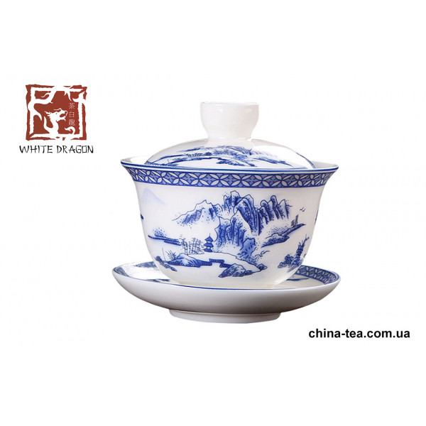Гайвань із цзіндечженьської порцеляни. Ручний розпис у жанрі цинхуа. Як основа узятий білий фарфор, на який легкий монохромний кобальтовий малюнок. Стінки помірно товсті, саме "тіло" посудини досить широке. Блюдце має поглиблення під саму гайвань.