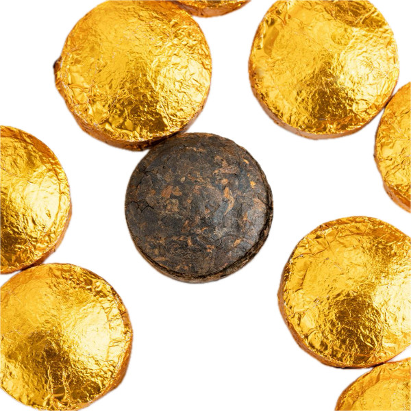 Selected Menhai shu pu'er made at the "Hop Cheong Hin" factory. Dry tea leaves are large, with the addition of golden tea buds. The pressing is not very tight. In dry form, the tea is characterized by a restrained aroma with notes of old wood. Brewed infusion – black, thick. This variety of shu puerh is brewed quite quickly, a strong infusion with a warm sweet-fruity aroma. The thick taste shows the softness of chocolate with bitterness and a sour fruity note.